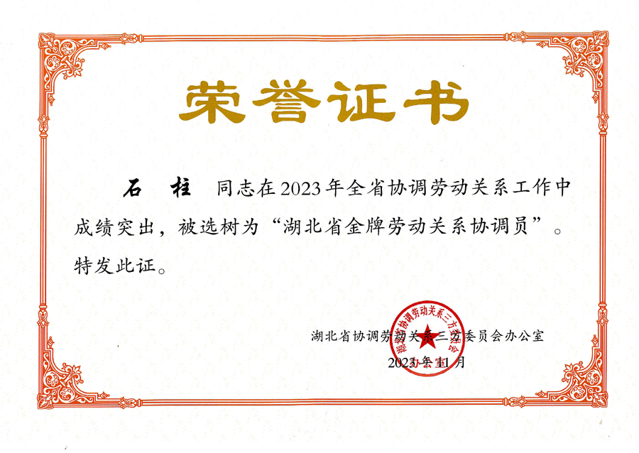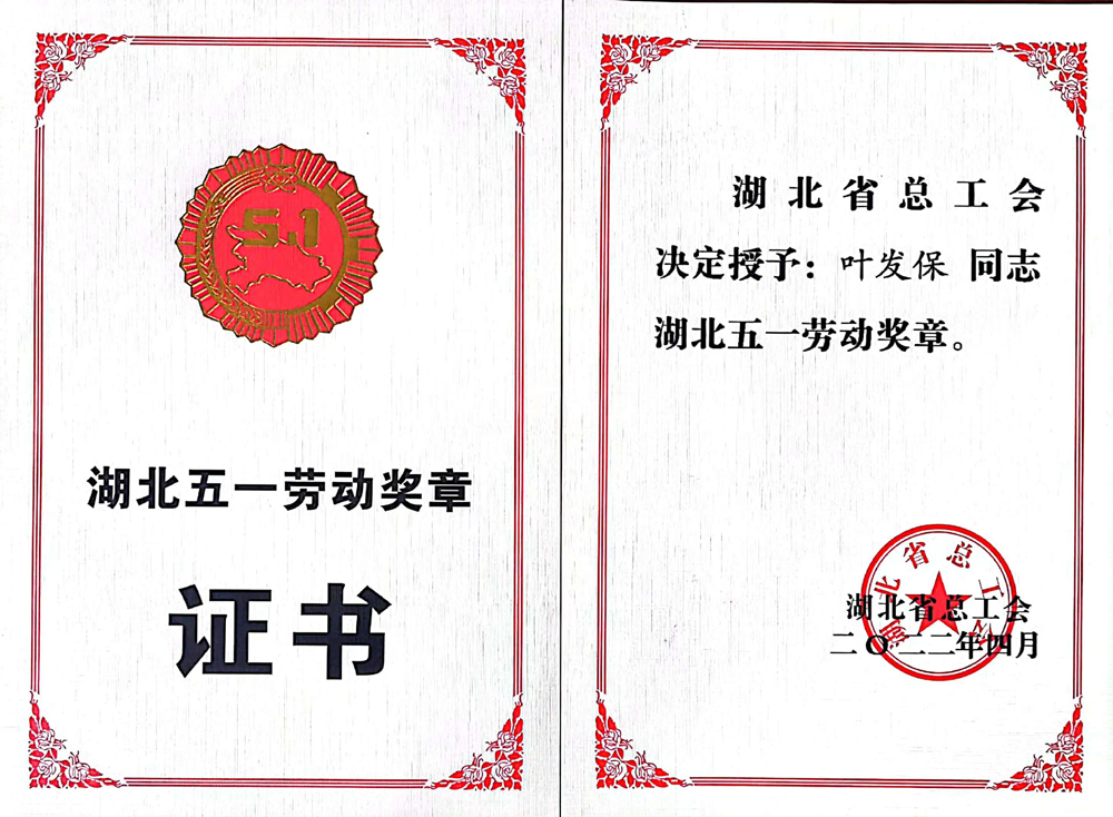 湖北省總工會(huì)授予集團(tuán)總經(jīng)理葉發(fā)?!拔逡粍趧?dòng)獎(jiǎng)?wù)隆惫鈽s稱(chēng)號(hào)