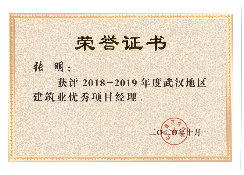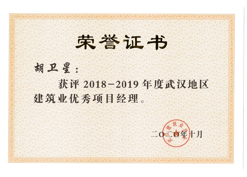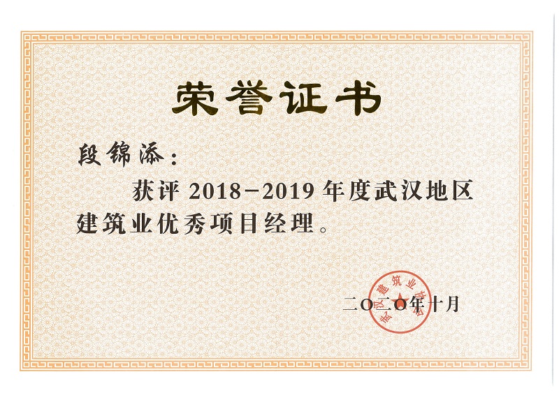 段錦添、胡衛(wèi)星、張明、徐勇剛、余建兵獲評2018-2019年度武漢地區(qū)建筑業(yè)優(yōu)秀項(xiàng)目經(jīng)理