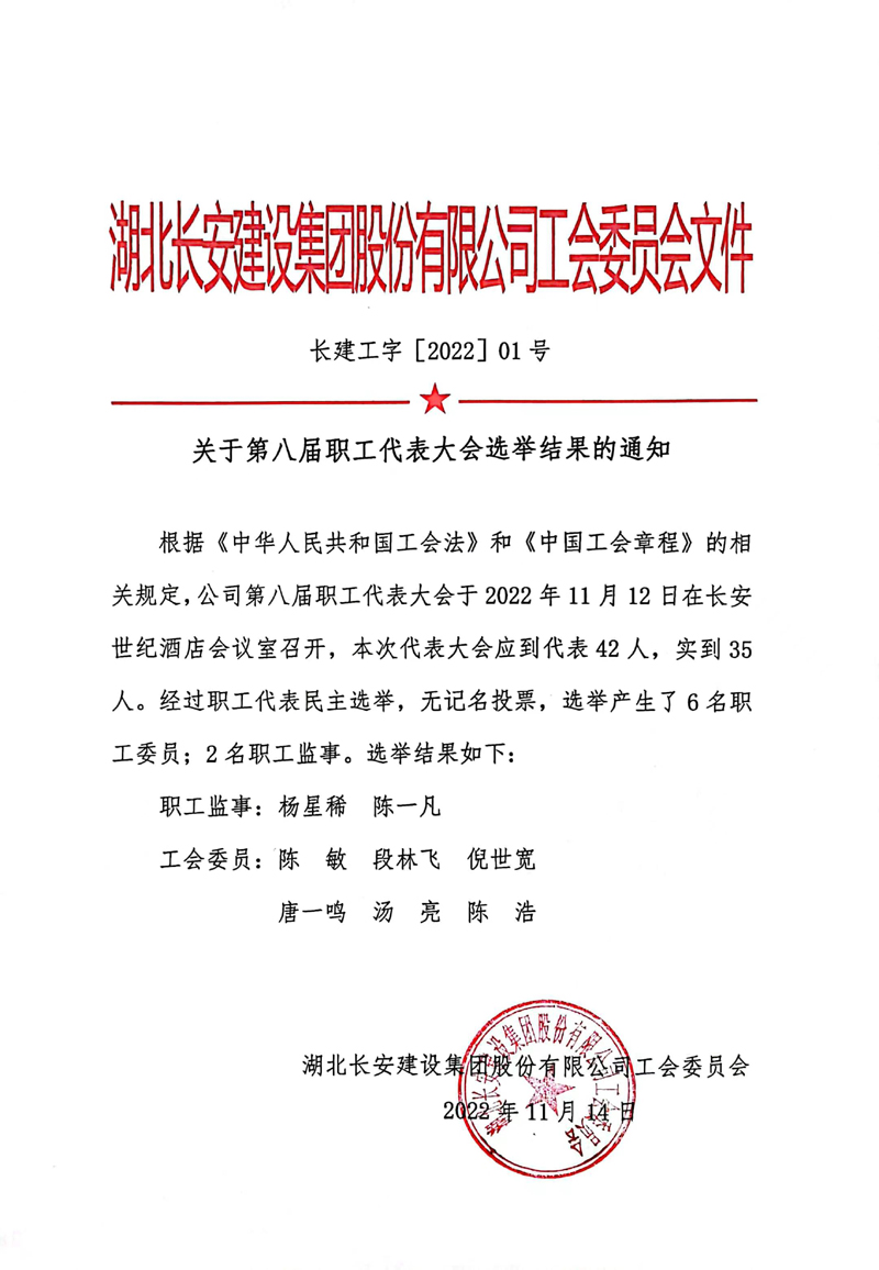 湖北長安建設(shè)集團(tuán)第八屆第一次職工代表大會選舉結(jié)果公告