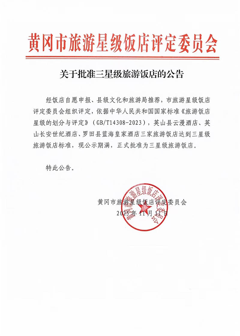 熱烈祝賀長安世紀(jì)酒店獲評“三星級旅游酒店”